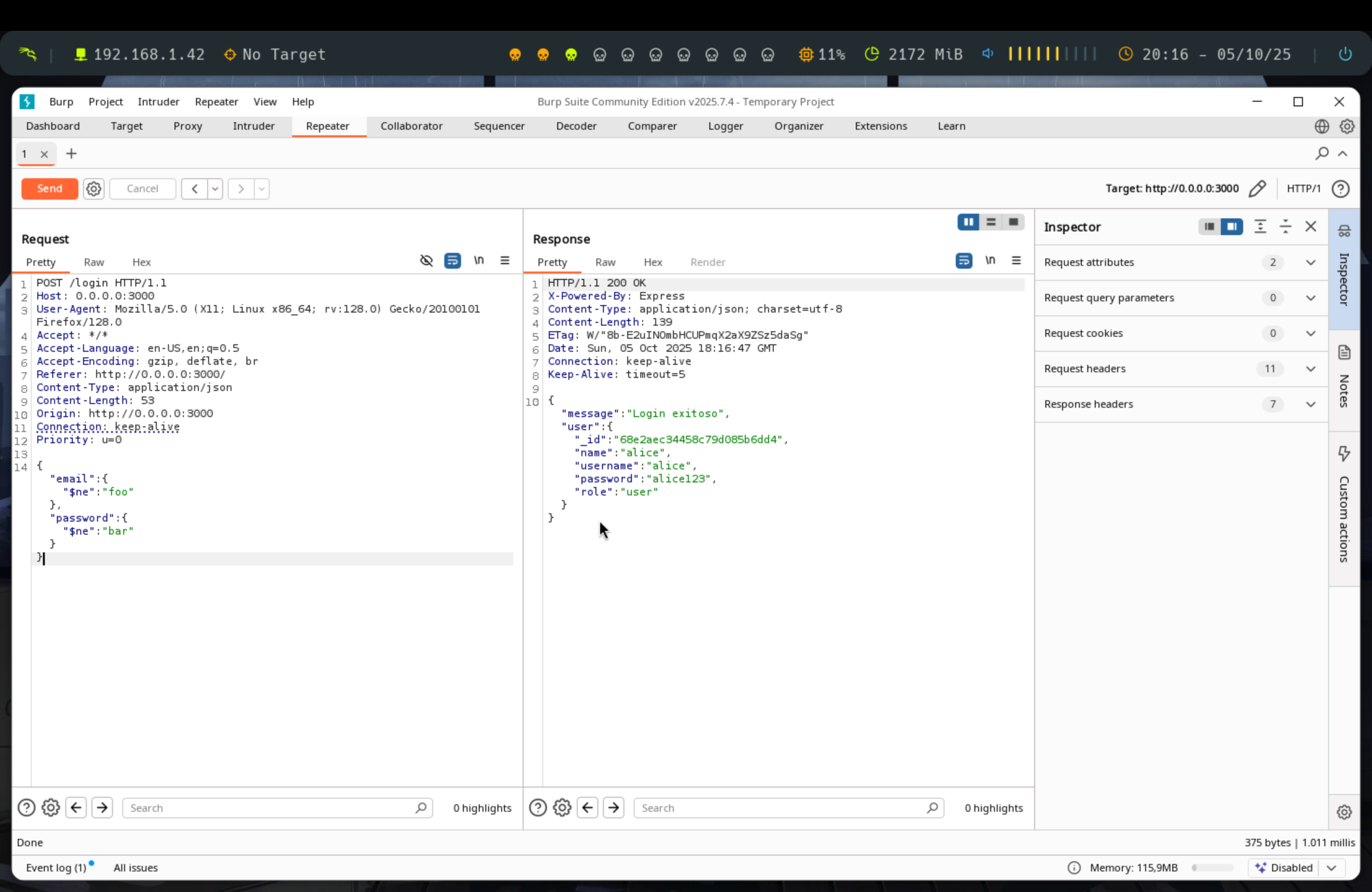 Mandamos la petición al repeater y preparamos nuestro payload, en este caso será una expresión regular que dirá que el mail NO es el que ponemos y la pass tampoco. Esto hará un bypass volcándonos todos las credenciales de la base de datos.