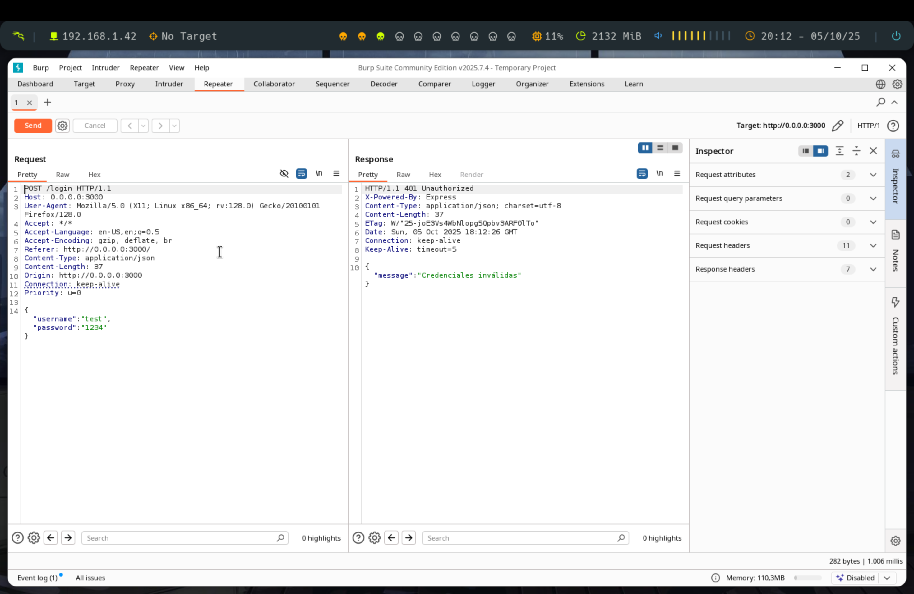 Probamos unas credenciales ficticias y capturamos la petición con Burpsuite.