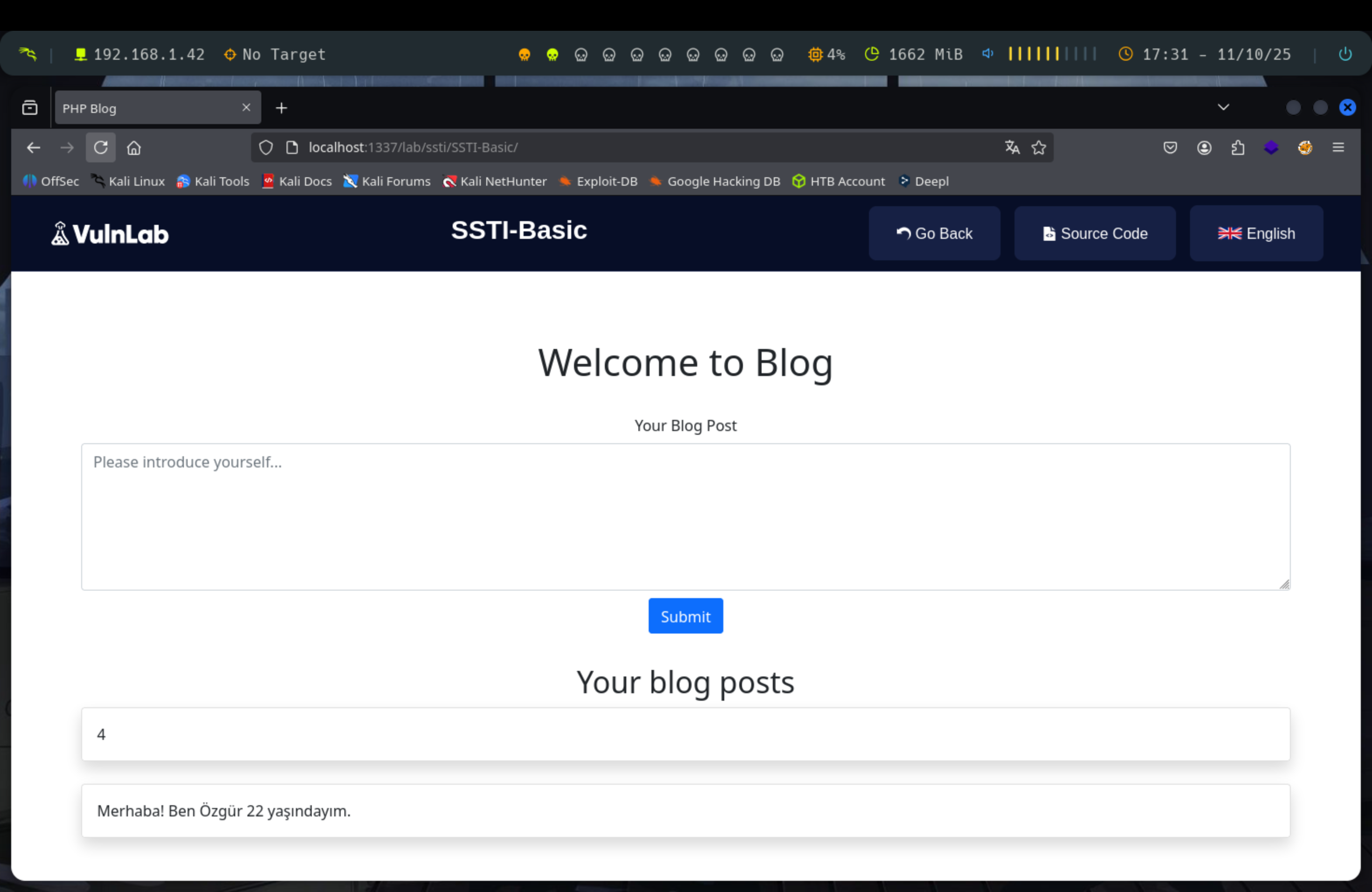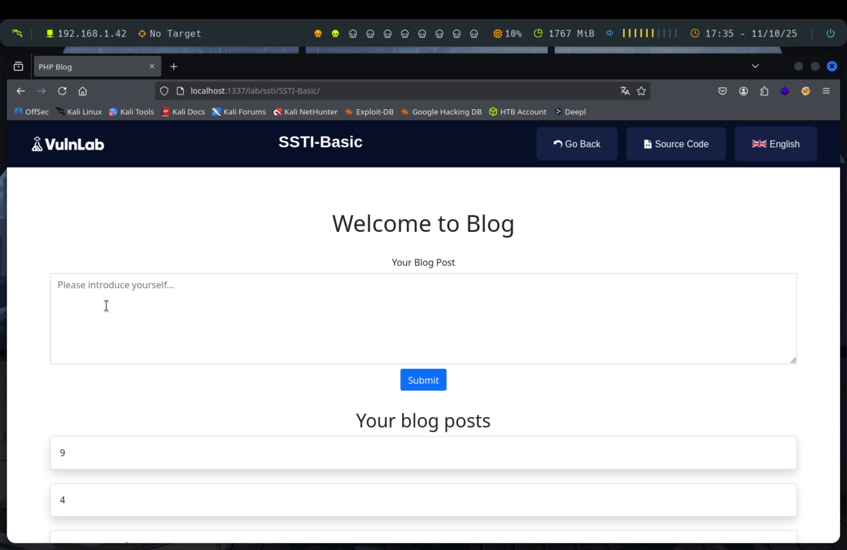 Tenemos una web en la que tenemos un input para enviar datos, así que probamos a ver si es vulnerable a SSTI. Para ello hay que comprobar si los datos que notros enviemos los trata como tales.