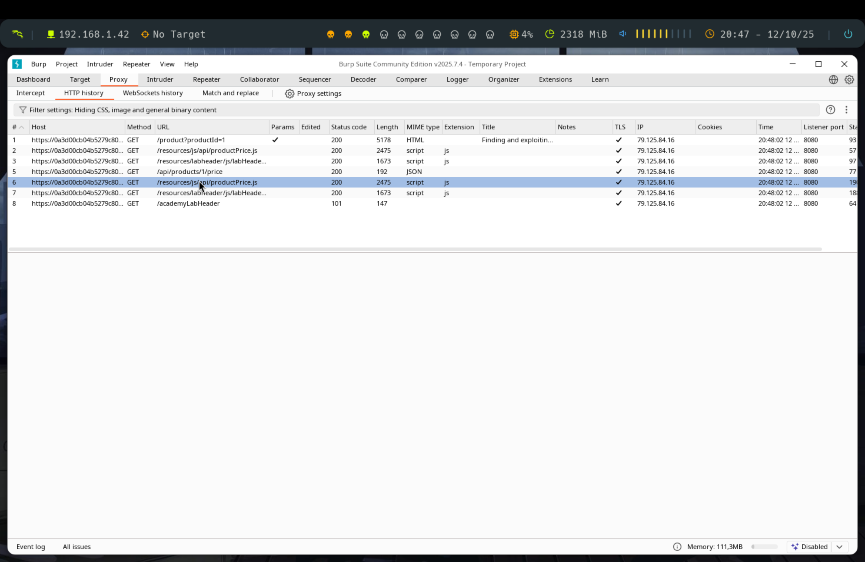 Nos movemos al apartado http history después de pinchar en un producto. Ahí vemos todos los links y observamos que uno es a la API.